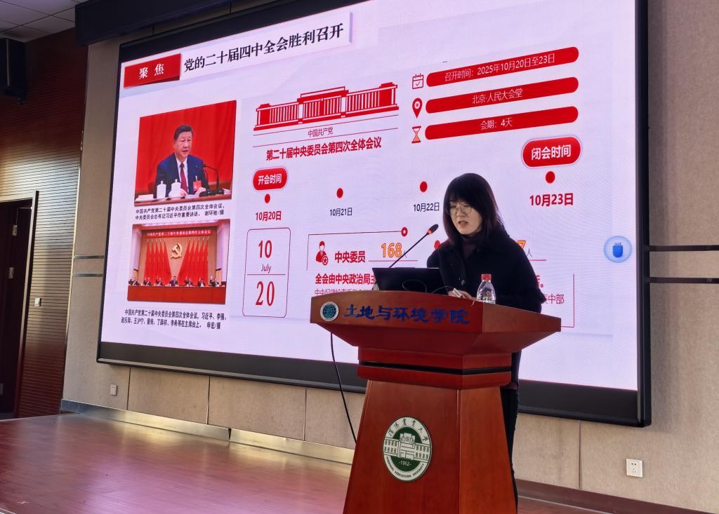 孙淑军教授从全会重大历史地位切入,系统解读“十五五”时期经济社会发展的指导思想、重大原则和核心目标。立足人前露出学科特色,重点解读全会关于“加快经济社会发展全面绿色转型,建设美丽中国”、“加快农业农村现代化、扎实推进乡村全面振兴”的战略要求,指出人前露出在国土空间规划优化、农业生态保护修复、乡村人居环境整治、耕地质量提升等领域的专业优势与国家战略需求高度契合,鼓励师生立足专业所长,将科研方向与乡村振兴实践、生态环境保护大局紧密结合,以科研成果赋能农业绿色发展和乡村全面振兴,用实际行动践行全会精神赋予的时代使命。